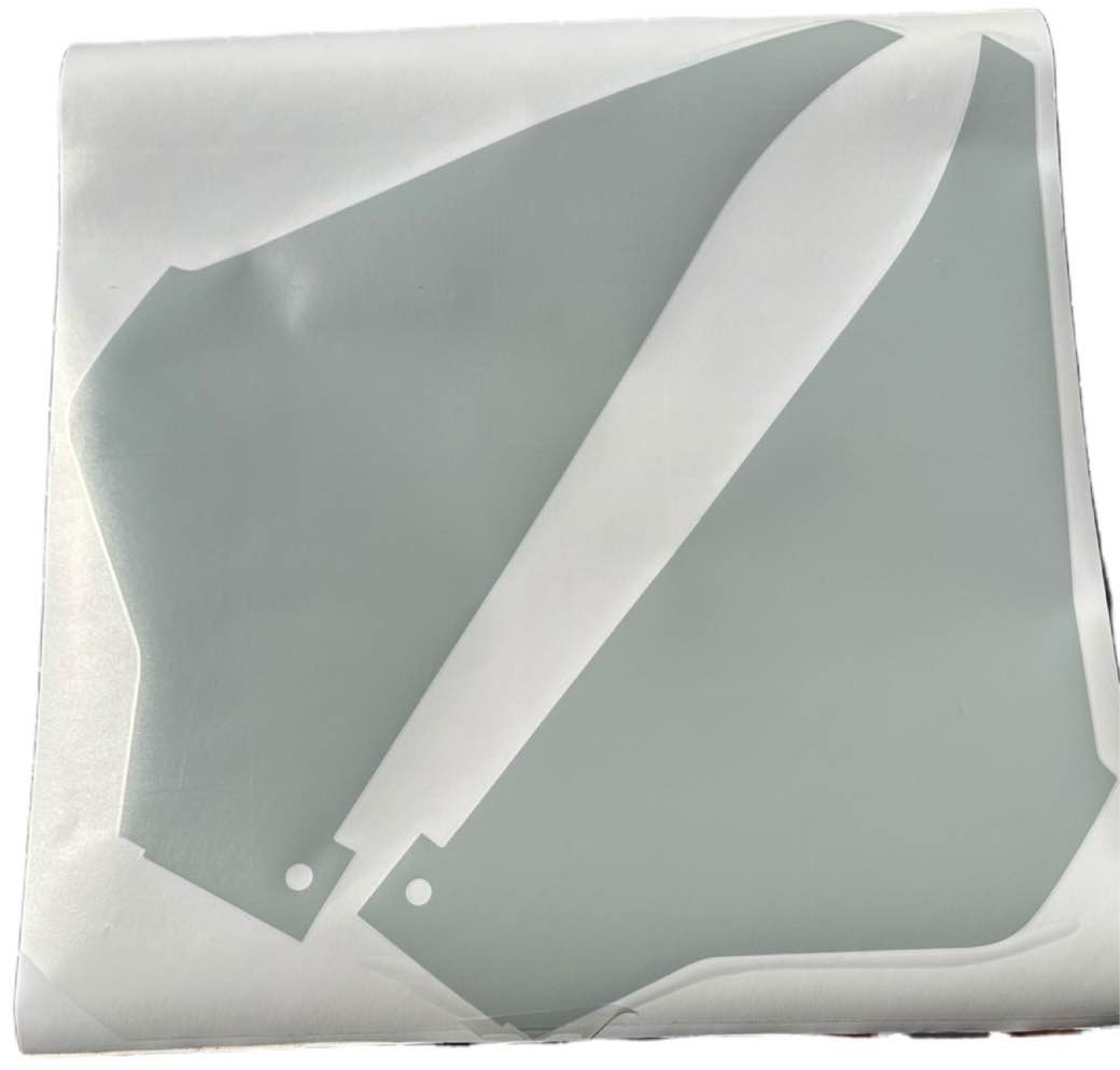 - Alternativ kann eine hellgraue Folie (wie beim Original) auf das Dreieck gesetzt werden. Allerdings passt auch hier die Farbe nicht optimal zum restlichen Farbton gris cormoran. Es wird RAL7035 Lichtgrau angeboten, was jedoch ebenfalls nicht zufriedenstellend ist. (Im Satz enthalten)